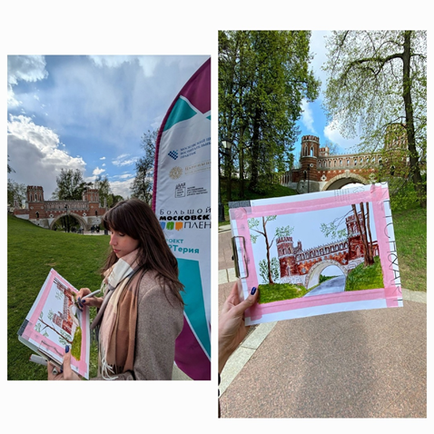 В конце апреля участники собрались, чтобы перенести на бумагу живописную царицынскую архитектуру, и Марина Павловна смогла продемонстрировать свои таланты и мастерство.