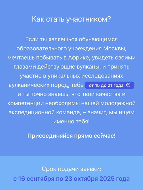 Департамент образования и науки города Москвы приглашает ваших детей, которым уже исполнилось 15 лет, принять участие в грандиозном образовательном проекте «Московская молодёжная экспедиция «Шесть лет – шесть вулканов. Африка – 2025»!